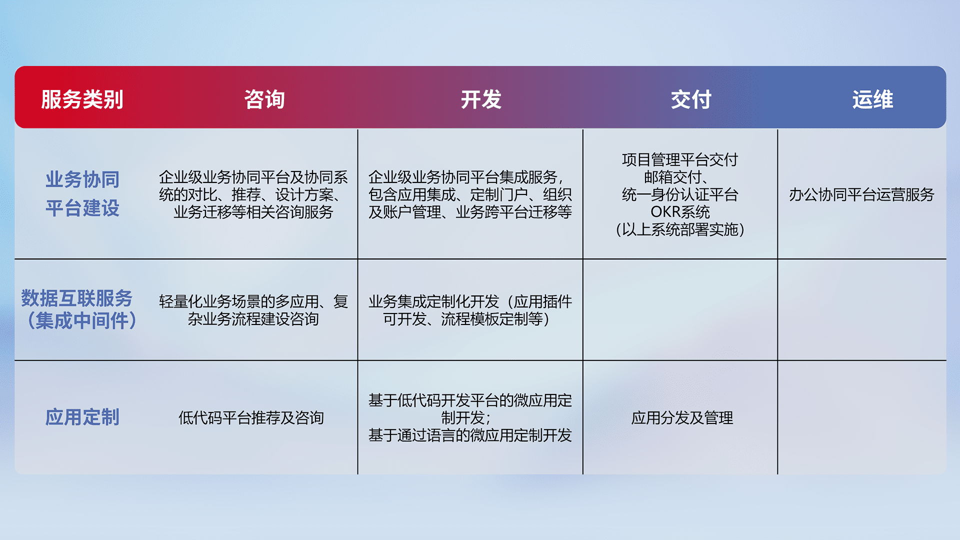 针对钉钉、、、、企微、、IDaas等平台级产品提供产品的规划、、、方案、、交付、、定制化开发等服务,,,实现如统一协同办公、、、、智能客户服务、、混合会议管理、、、、智能数据查询、、等业务场景,,实现数字化转型。。。